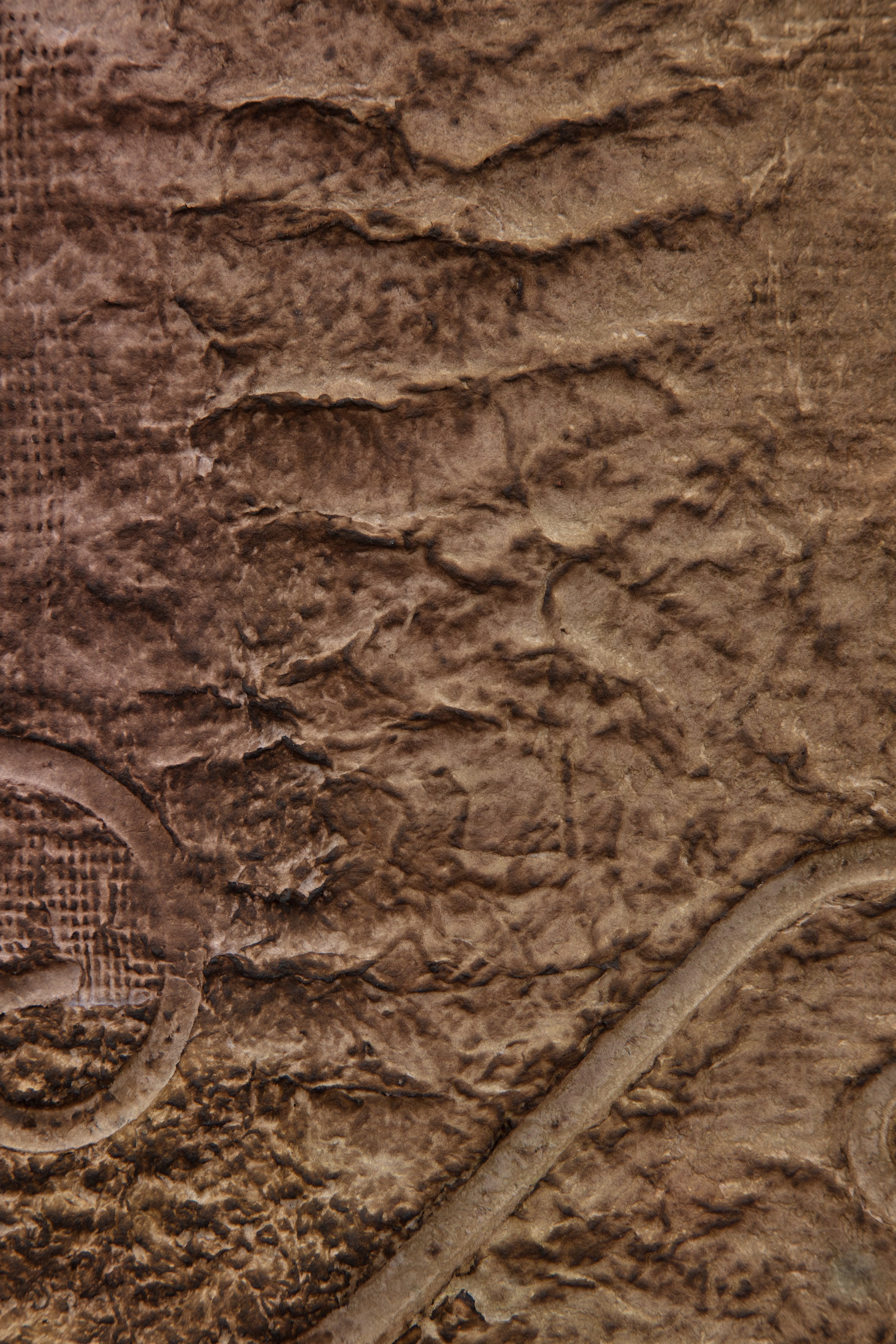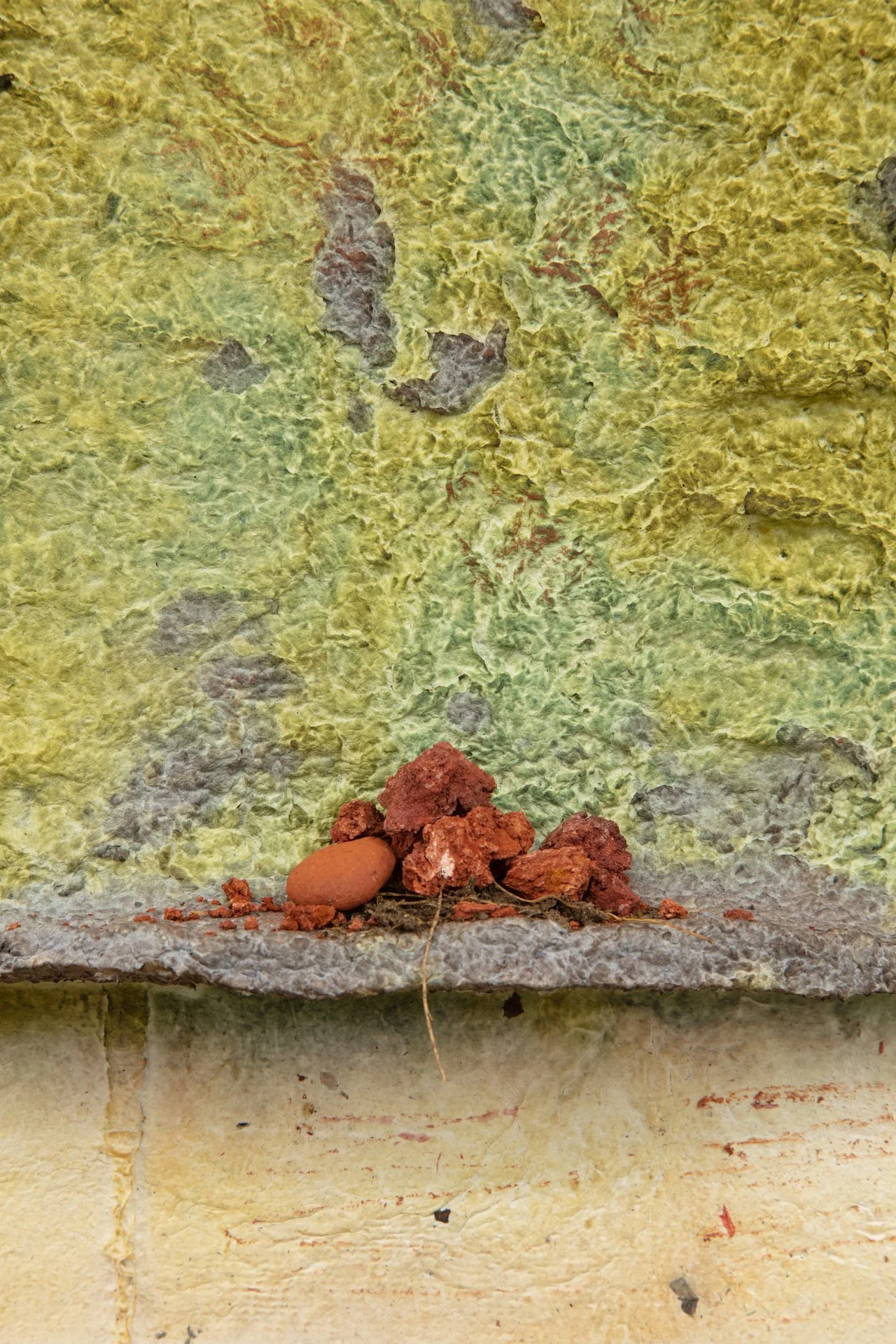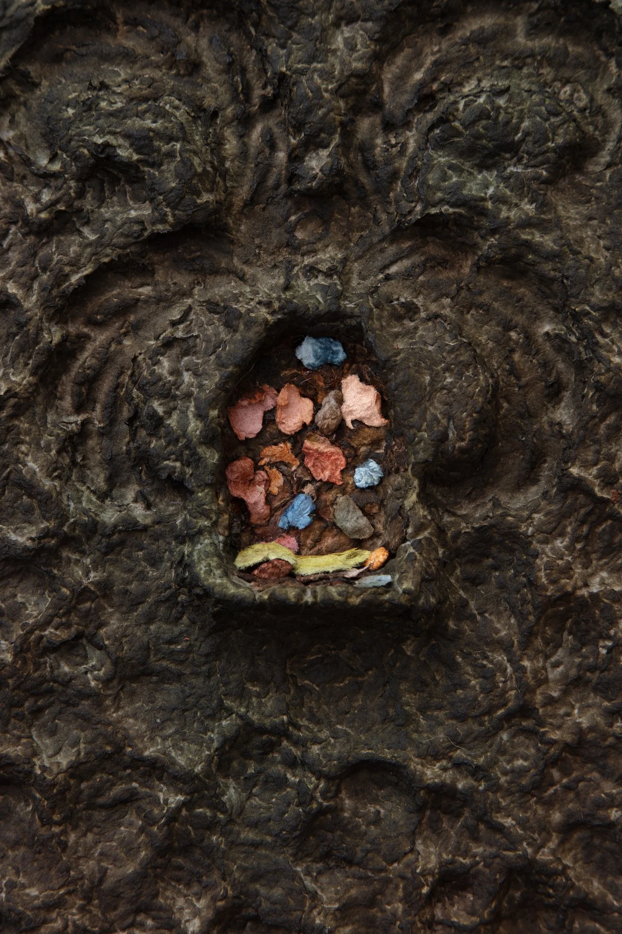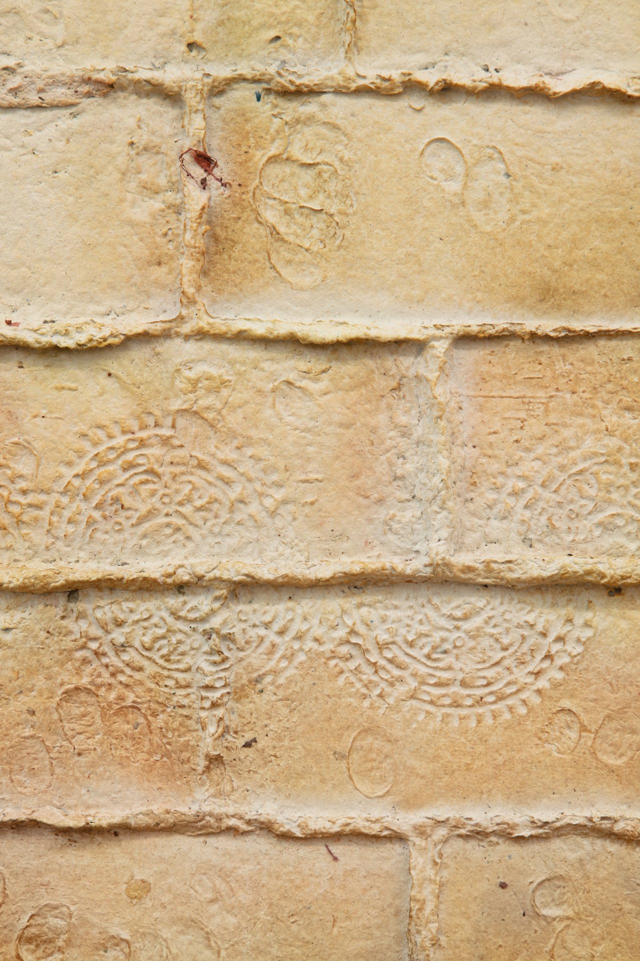 Minai begins each artwork with kitchen blenders, creating a liquid pulp by mixing found paper with recycled water. Brick outlines on her studio floor are placed to determine the borders of an artwork—Minai fills these temporary plastic-lined shallow molds with a patchwork mass of strained and pigmented pulp. Once a brick-mold is full, Minai presses an array of objects into the surface of the pulp—creating patterns from parts of salvaged buildings, textile woodblocks, and other decommissioned artifacts that provide a link to generational and cultural histories. Small sculptural elements such as paper pulp hands, flowers, altars, and other biological or architectural motifs are added as needed. Though Rome wasn’t built in a day, Minai must complete each work during one epic and laborious studio session, predicated by drying times. Impressions of Minai’s fingertips are preserved like fossilized footprints that emerge from a lakebed during a drought. Embodying loss, bittersweetness, and nostalgia Minai embraces these human traces, aligning her sculptural process with geological time—fossils are but a stone’s memory of the bones of an animal.