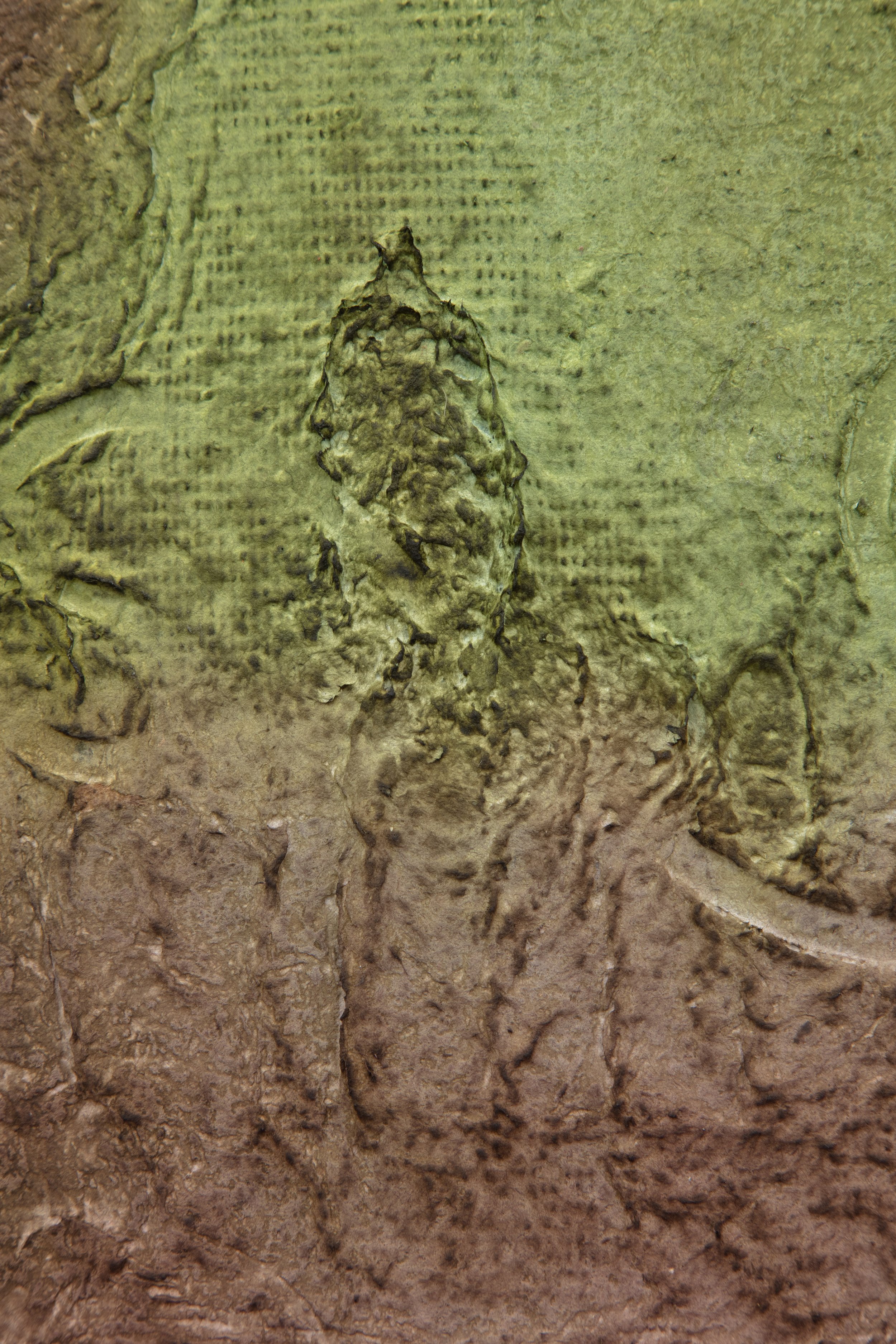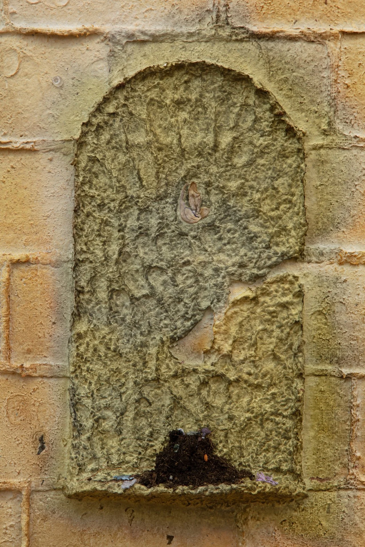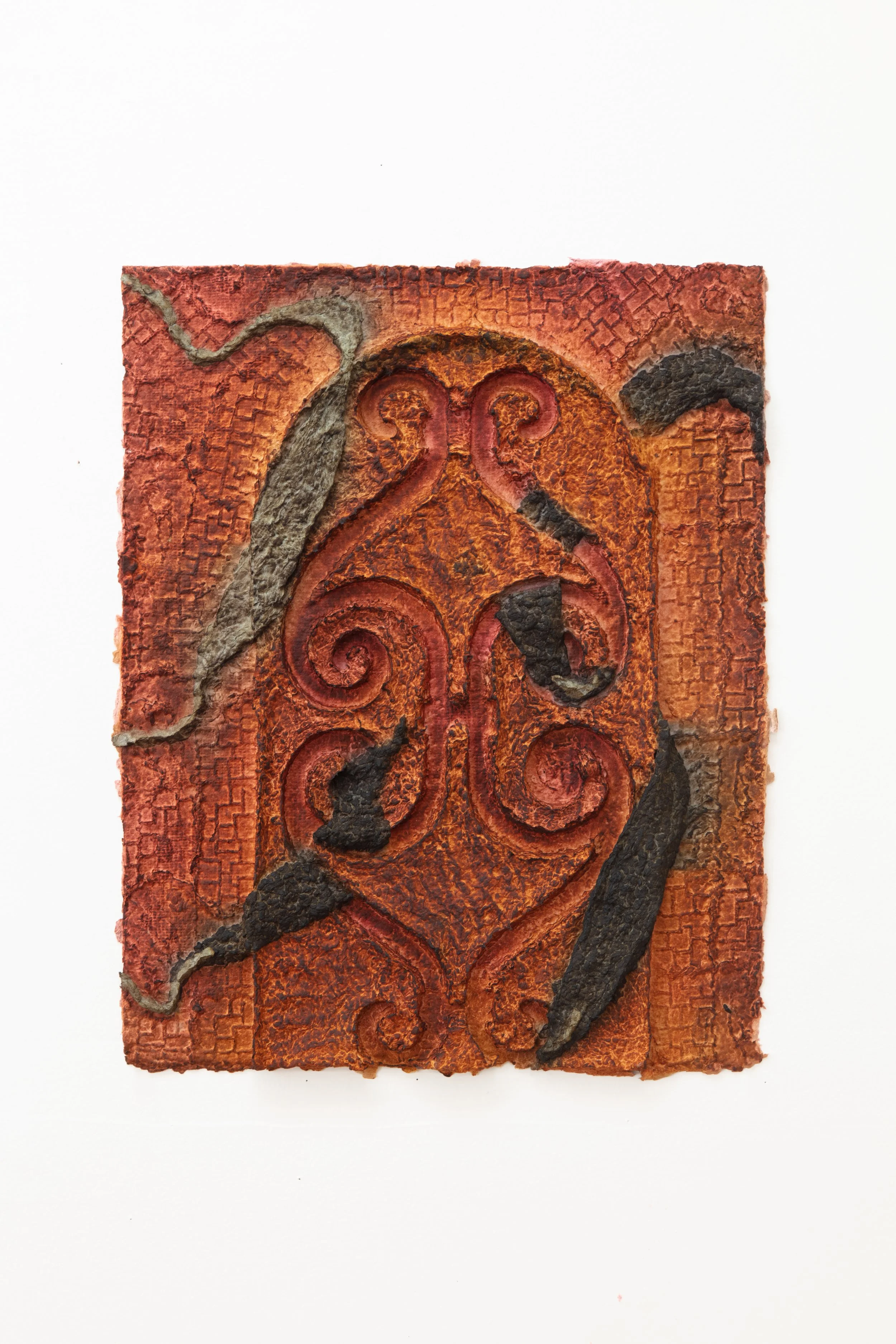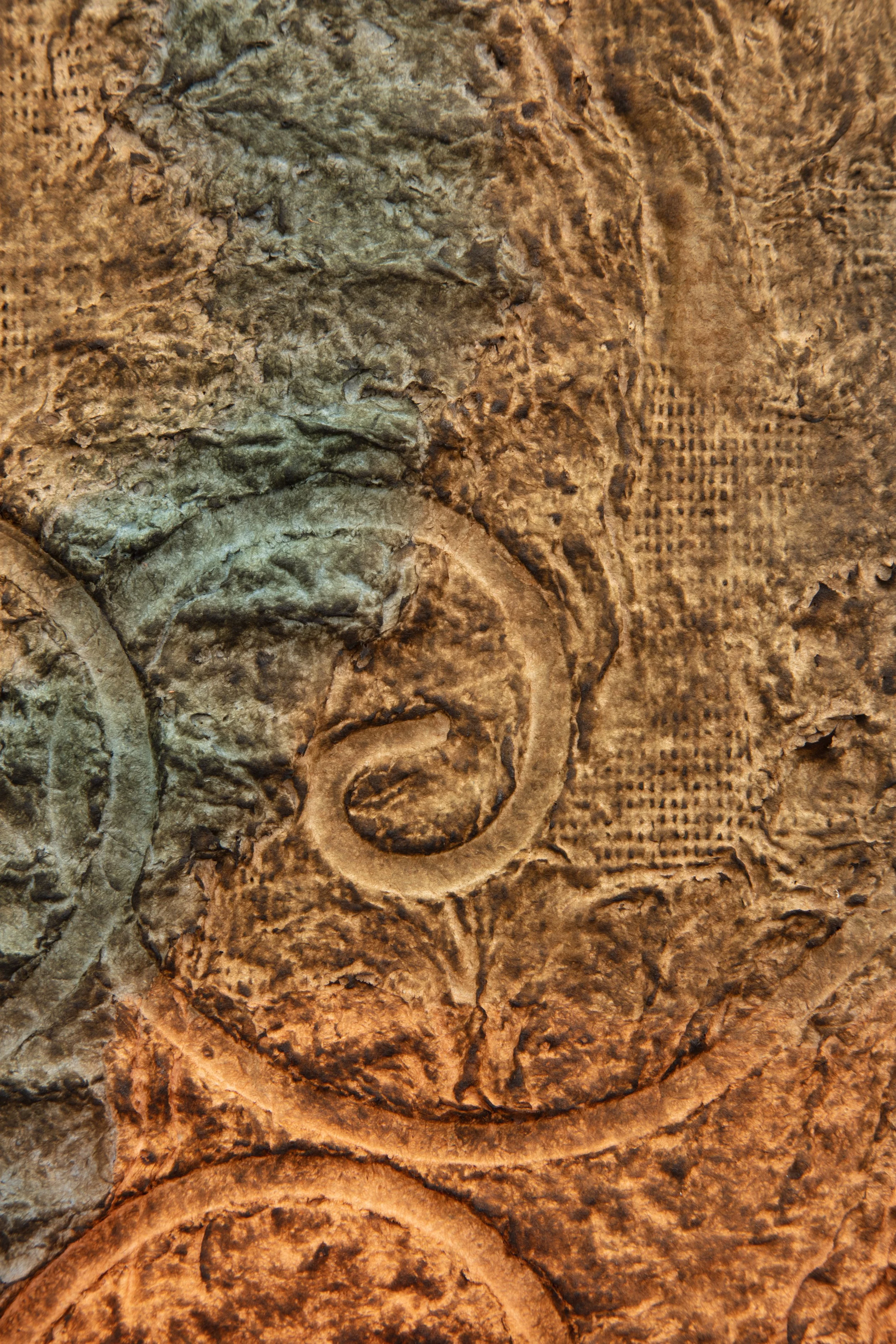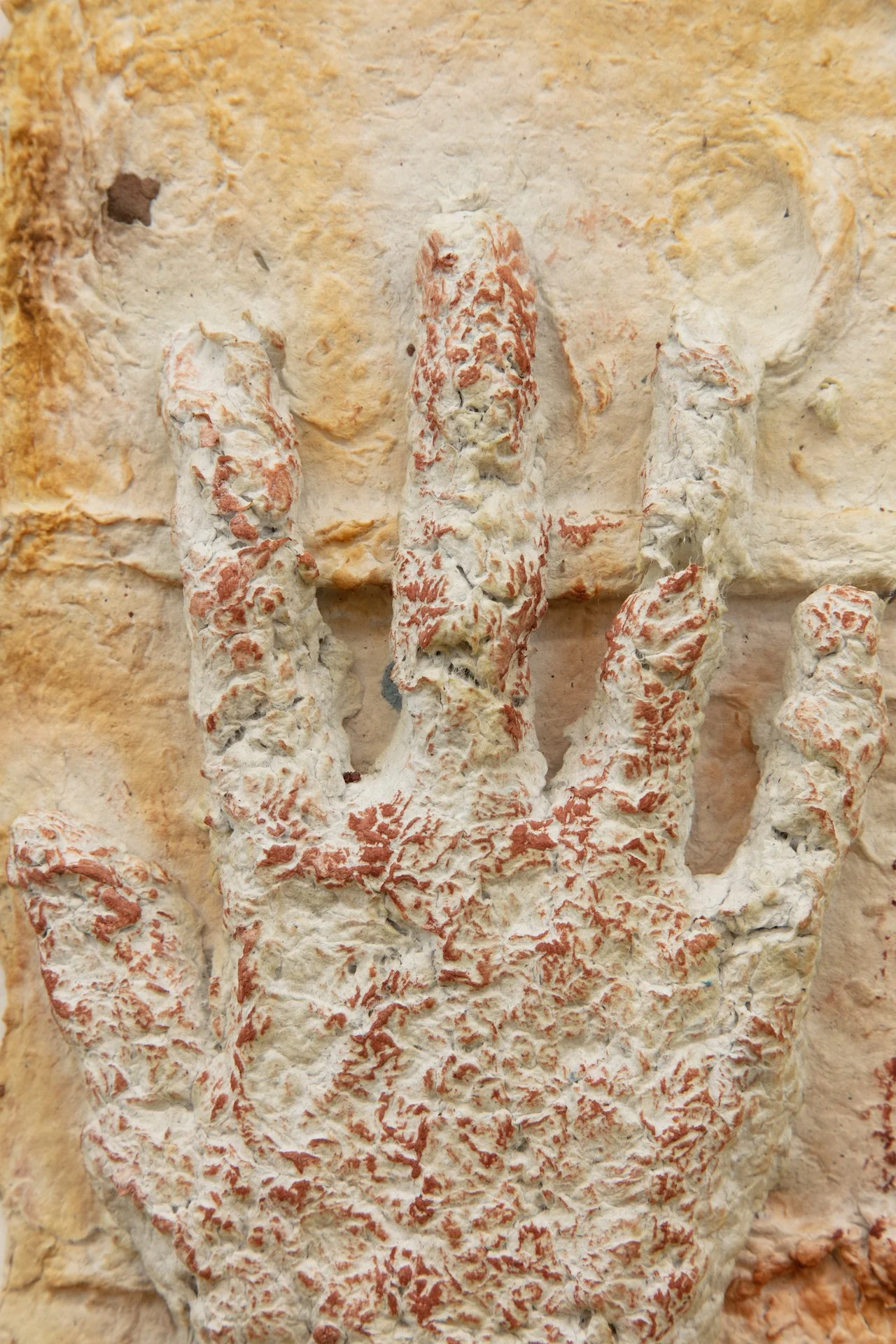 Minai begins each artwork with kitchen blenders, creating a liquid pulp by mixing found paper with recycled water. Brick outlines on her studio floor are placed to determine the borders of an artwork—Minai fills these temporary plastic-lined shallow molds with a patchwork mass of strained and pigmented pulp. Once a brick-mold is full, Minai presses an array of objects into the surface of the pulp—creating patterns from parts of salvaged buildings, textile woodblocks, and other decommissioned artifacts that provide a link to generational and cultural histories. Small sculptural elements such as paper pulp hands, flowers, altars, and other biological or architectural motifs are added as needed. Though Rome wasn’t built in a day, Minai must complete each work during one epic and laborious studio session, predicated by drying times. Impressions of Minai’s fingertips are preserved like fossilized footprints that emerge from a lakebed during a drought. Embodying loss, bittersweetness, and nostalgia Minai embraces these human traces, aligning her sculptural process with geological time—fossils are but a stone’s memory of the bones of an animal.