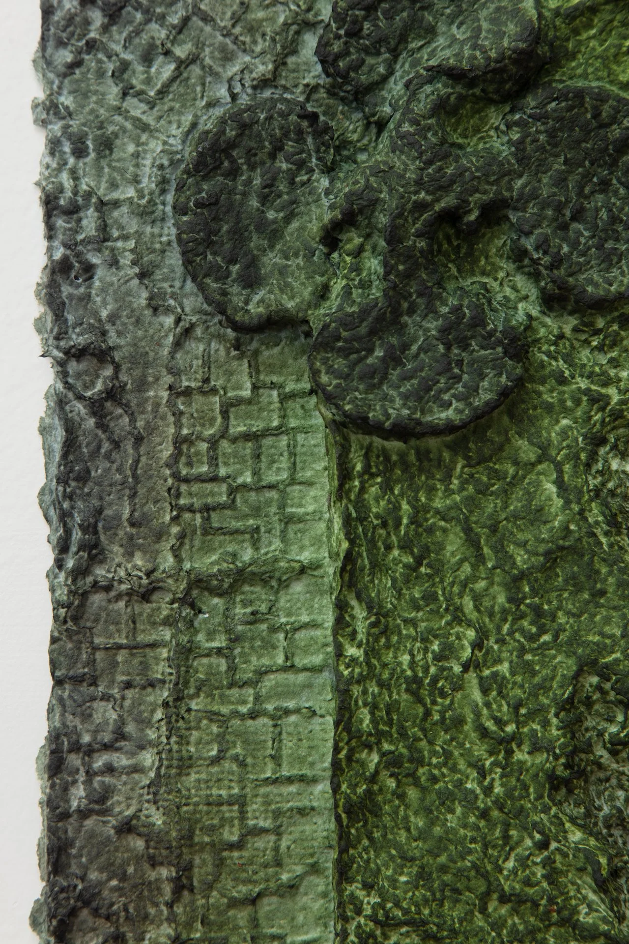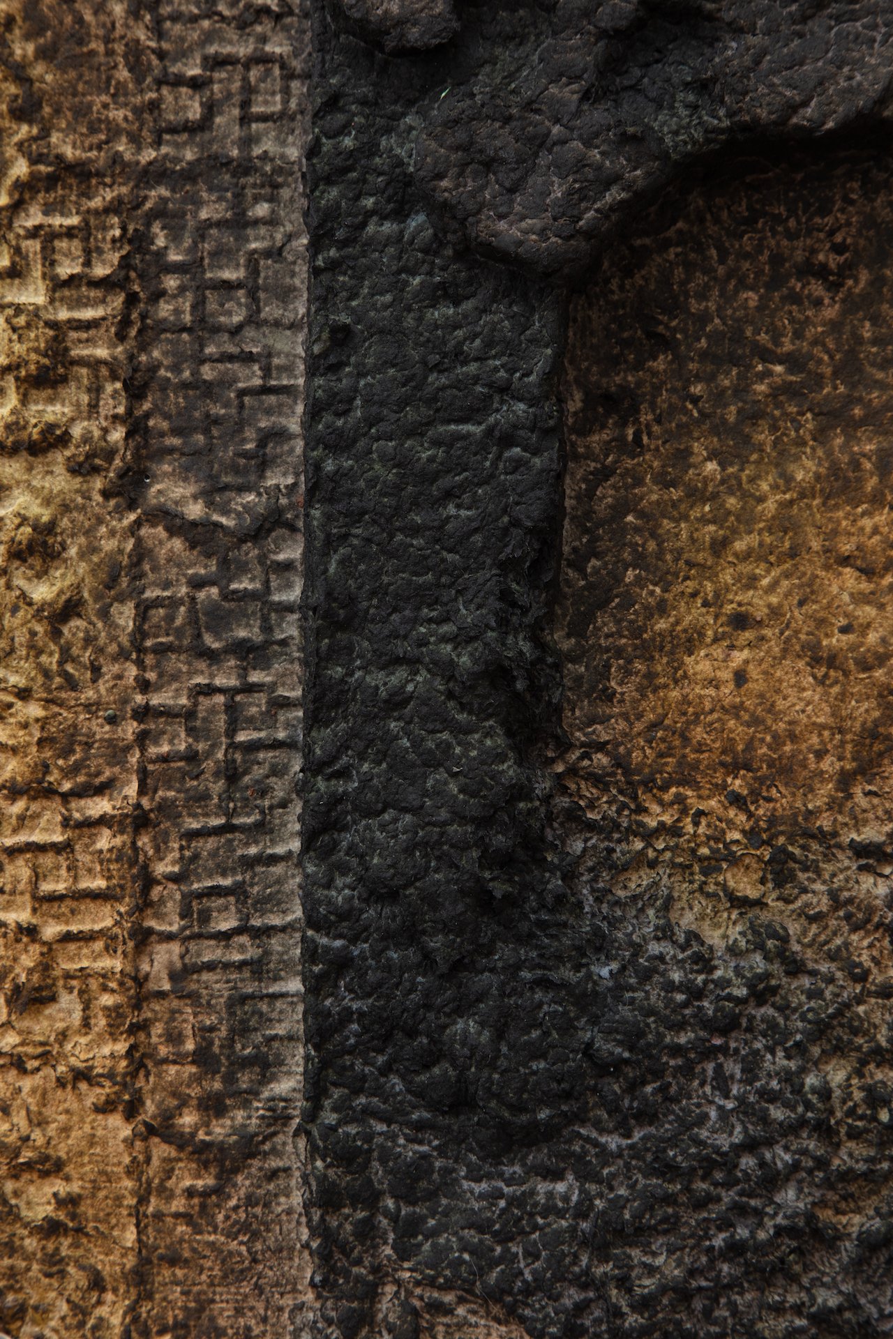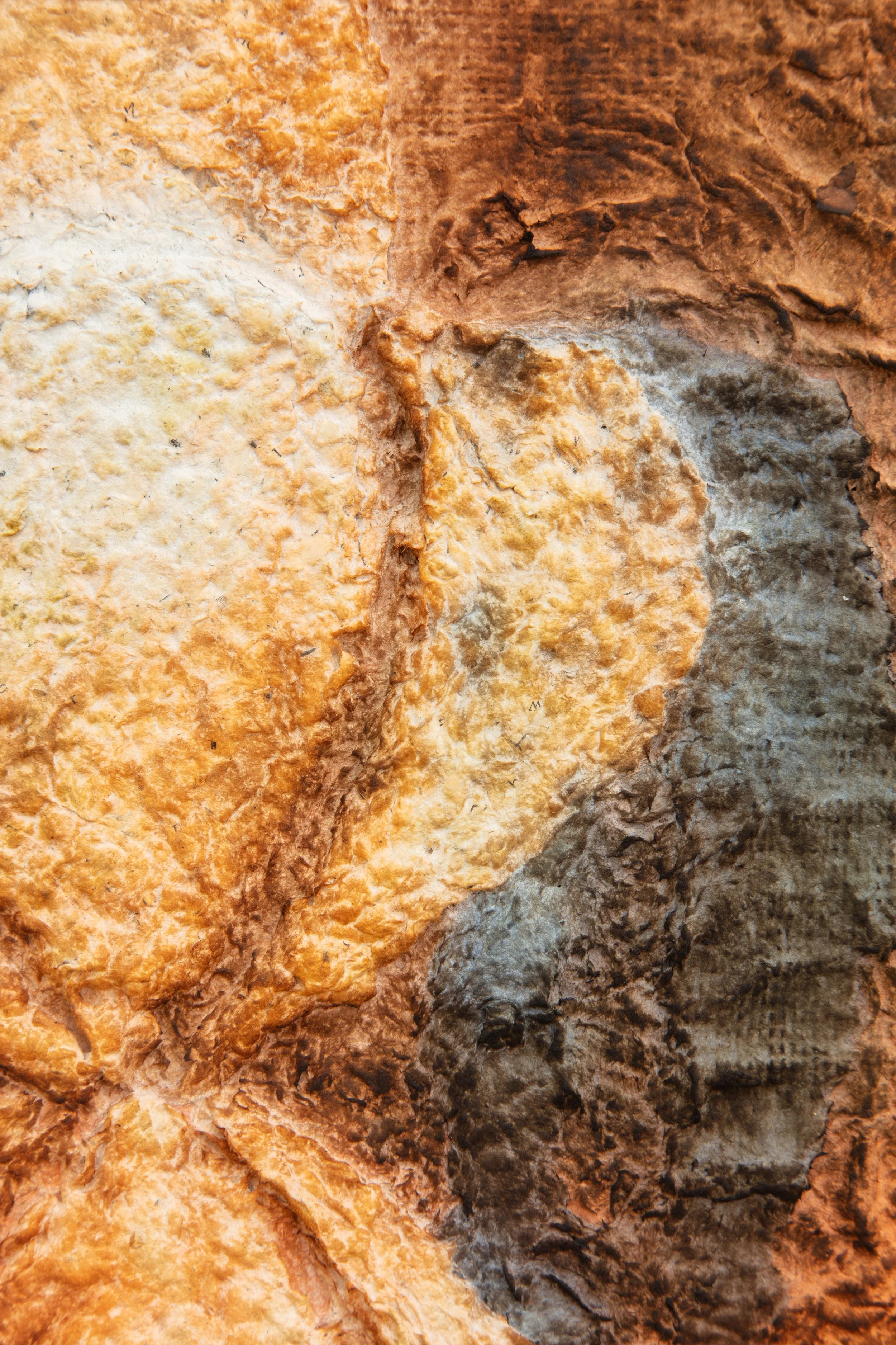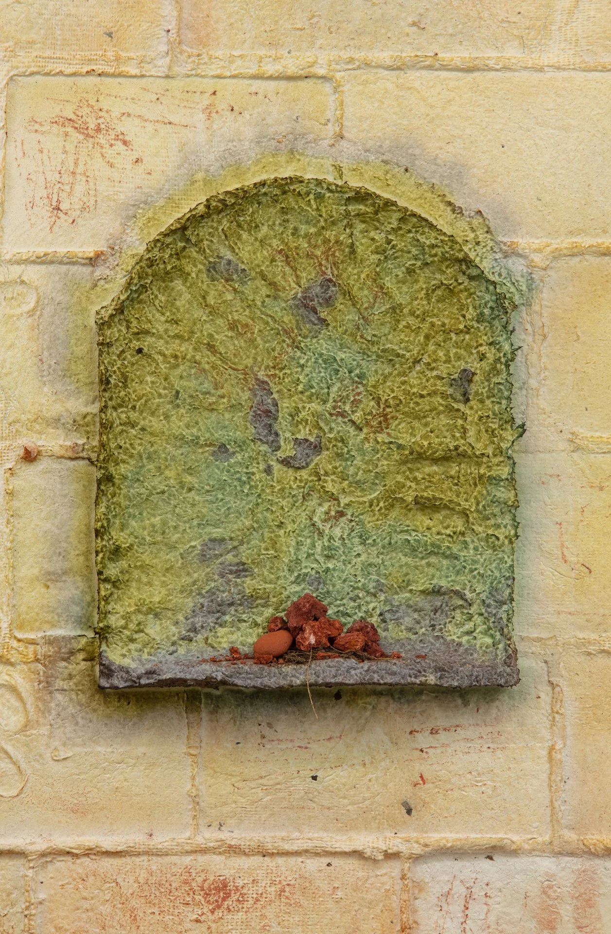 Minai begins each artwork with kitchen blenders, creating a liquid pulp by mixing found paper with recycled water. Brick outlines on her studio floor are placed to determine the borders of an artwork—Minai fills these temporary plastic-lined shallow molds with a patchwork mass of strained and pigmented pulp. Once a brick-mold is full, Minai presses an array of objects into the surface of the pulp—creating patterns from parts of salvaged buildings, textile woodblocks, and other decommissioned artifacts that provide a link to generational and cultural histories. Small sculptural elements such as paper pulp hands, flowers, altars, and other biological or architectural motifs are added as needed. Though Rome wasn’t built in a day, Minai must complete each work during one epic and laborious studio session, predicated by drying times. Impressions of Minai’s fingertips are preserved like fossilized footprints that emerge from a lakebed during a drought. Embodying loss, bittersweetness, and nostalgia Minai embraces these human traces, aligning her sculptural process with geological time—fossils are but a stone’s memory of the bones of an animal.