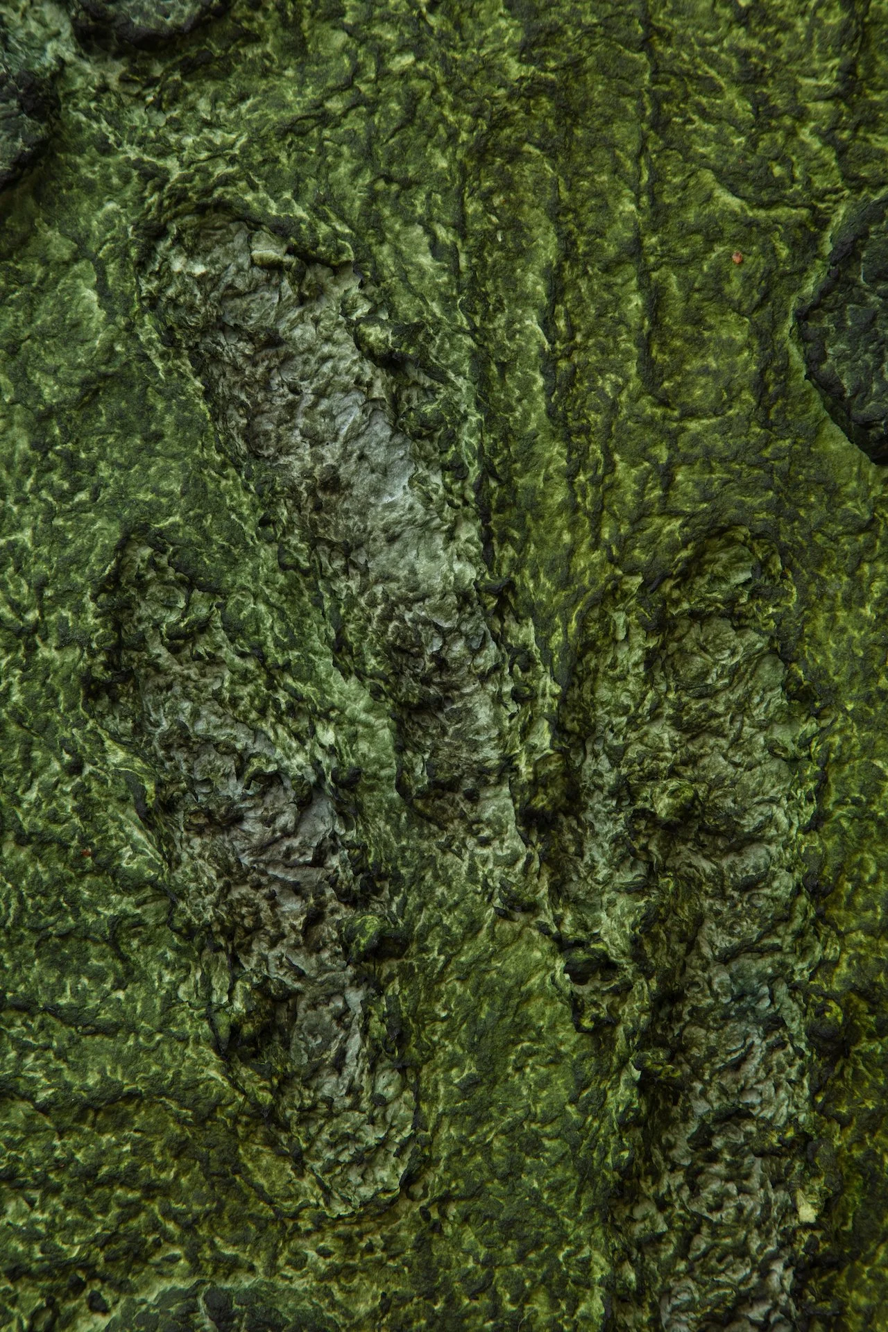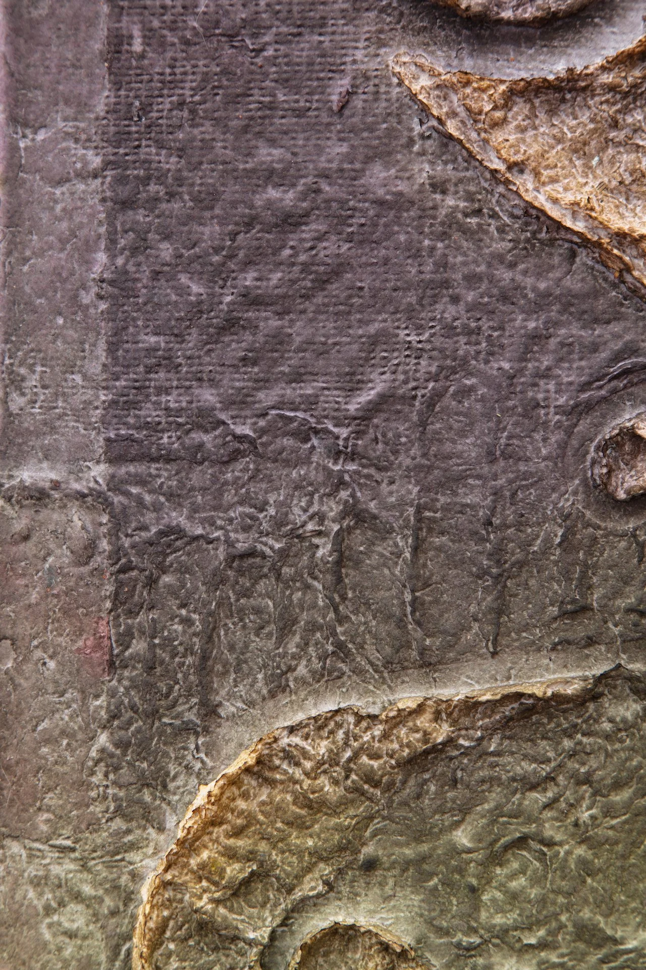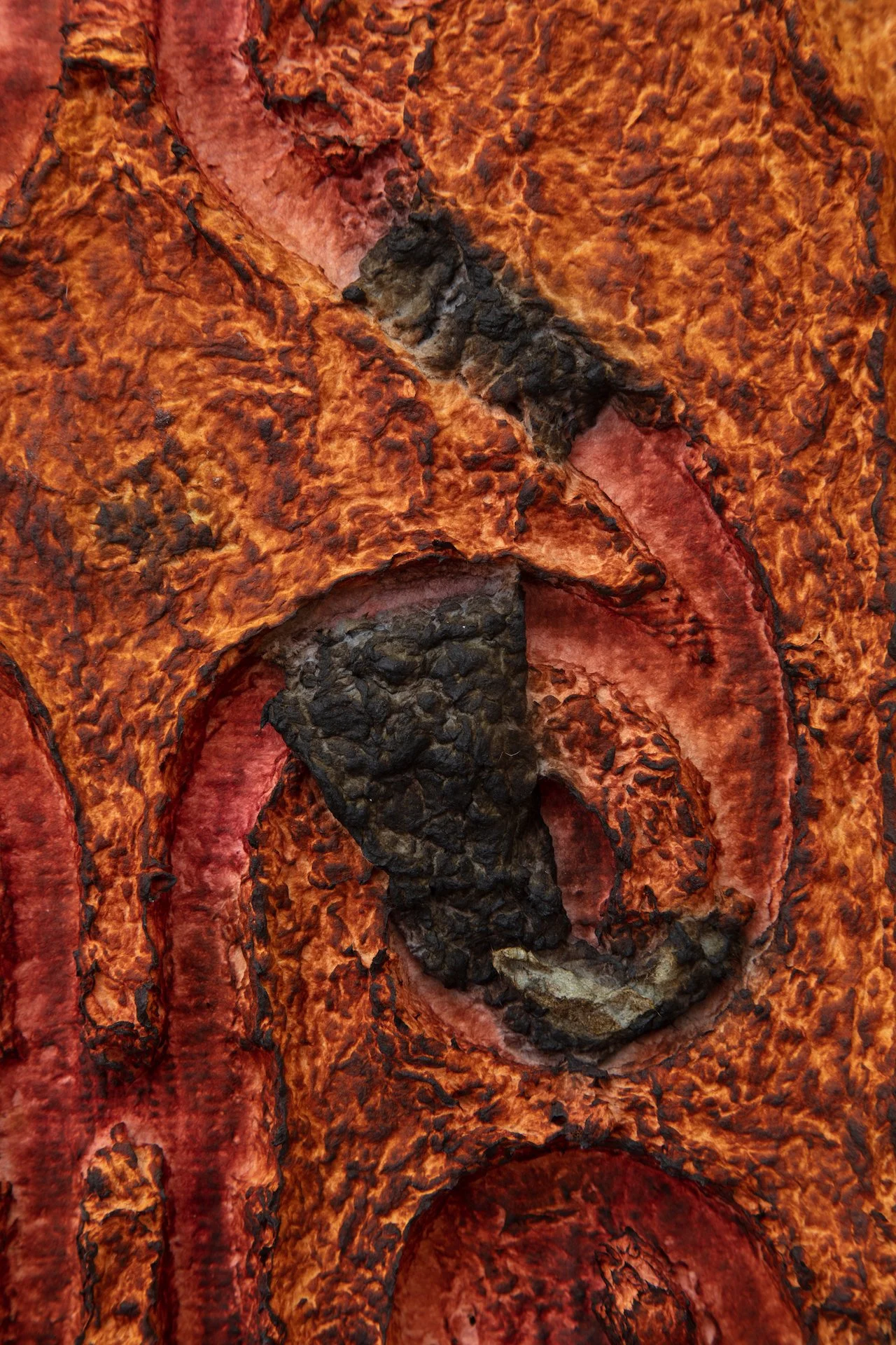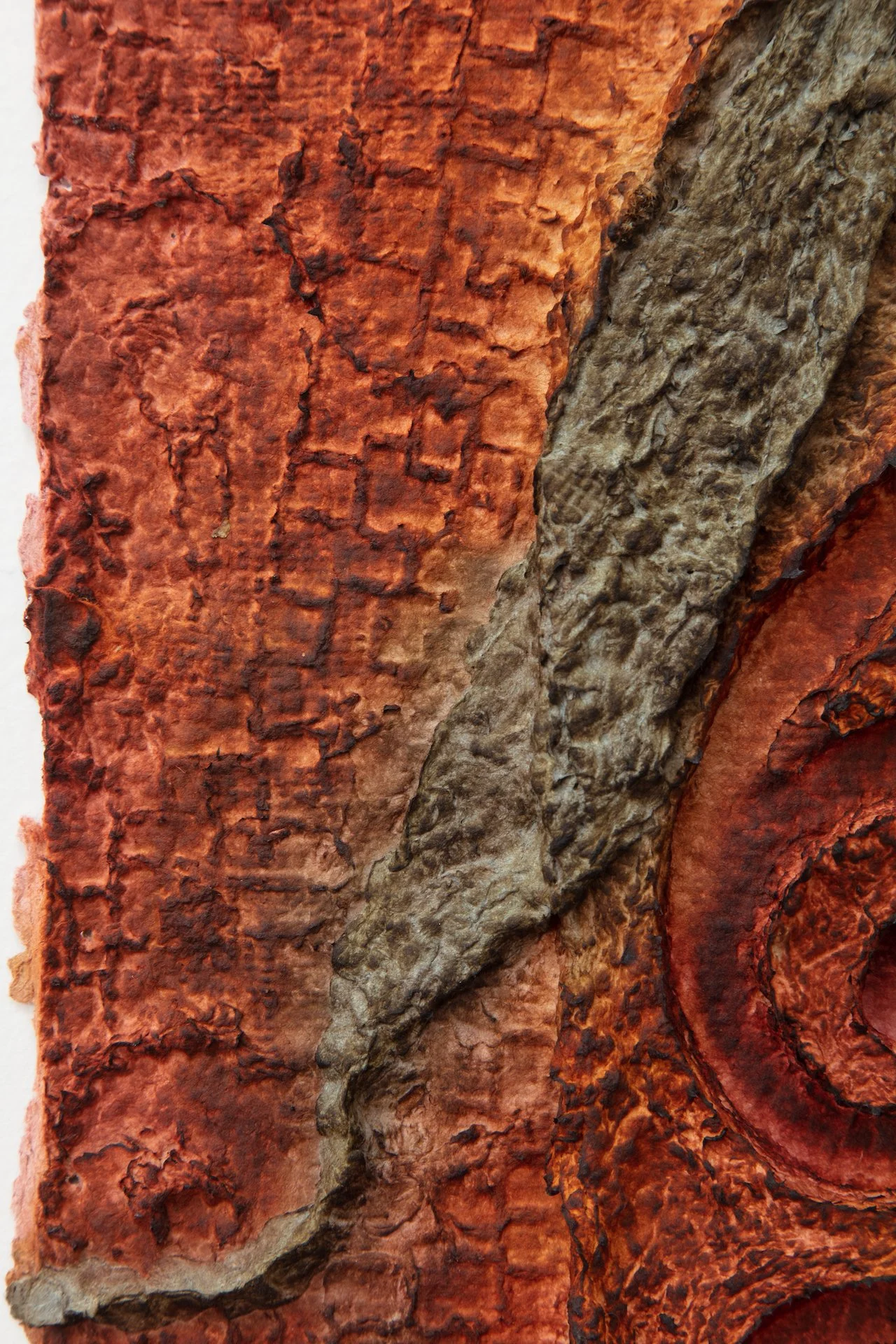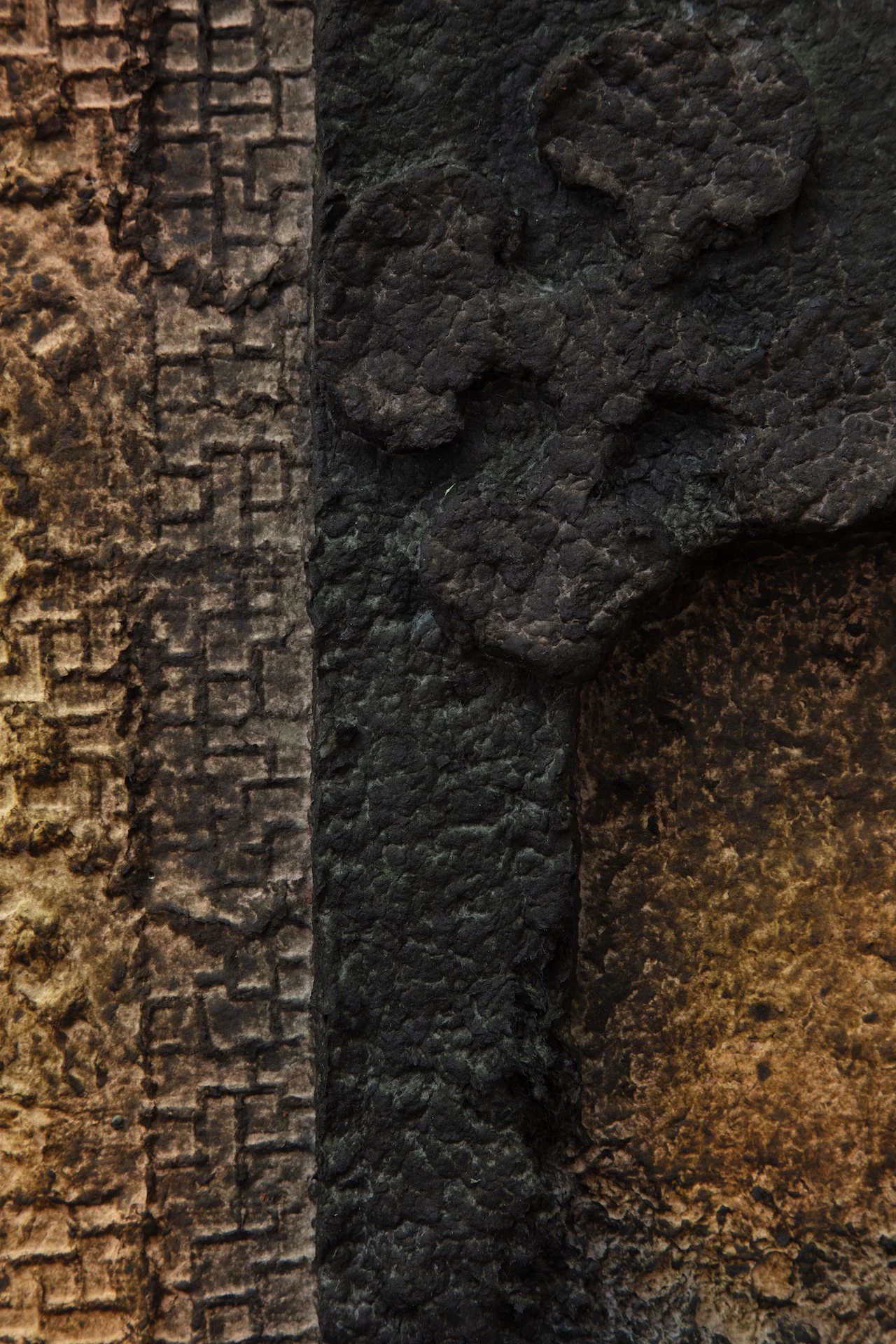 Minai begins each artwork with kitchen blenders, creating a liquid pulp by mixing found paper with recycled water. Brick outlines on her studio floor are placed to determine the borders of an artwork—Minai fills these temporary plastic-lined shallow molds with a patchwork mass of strained and pigmented pulp. Once a brick-mold is full, Minai presses an array of objects into the surface of the pulp—creating patterns from parts of salvaged buildings, textile woodblocks, and other decommissioned artifacts that provide a link to generational and cultural histories. Small sculptural elements such as paper pulp hands, flowers, altars, and other biological or architectural motifs are added as needed. Though Rome wasn’t built in a day, Minai must complete each work during one epic and laborious studio session, predicated by drying times. Impressions of Minai’s fingertips are preserved like fossilized footprints that emerge from a lakebed during a drought. Embodying loss, bittersweetness, and nostalgia Minai embraces these human traces, aligning her sculptural process with geological time—fossils are but a stone’s memory of the bones of an animal.